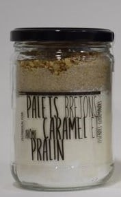 Farine de blé, sucre, praliné en grain >5% (sucre, noisettespeut contenir du lait), poudre à lever (pyrophosphate acide de sodium : E450i, bicarbonate de soude : E500ii, amidon de bléPeut contenir des traces de soja, lait, sésame), arôme caramel <1%, extrait d'orge de malt.