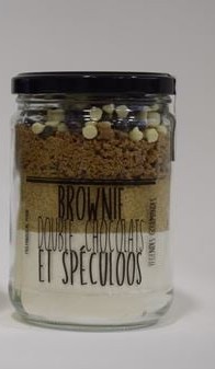 Farine de blé, cassonade, poudre de spéculoos 10% (farine de froment, sucre candi, matières grasses végétales non hydrogénées, sucre de canne brut, farine de soja, sucre inverti, carbonate acide de sodium, cannelle, muscade), chocolat blanc 5% (sucre, sucre du lait 25,5%, beurre de cacao 22,5%, matière grasse laitière, émulsifiant : lécithine de soja, amidon modifié, arôme), chocolat noir 5% (sucre, pâte de cacao 39%, beurre de cacao 3%, cacao maigre en poudre, émulsifiant : lécithine de tournesol), poudre à lever (pyrophosphate acide de sodium : E450i, bicarbonate de soude : E500ii, amidon de blé. Peut contenir des traces de soja, lait, sésame).