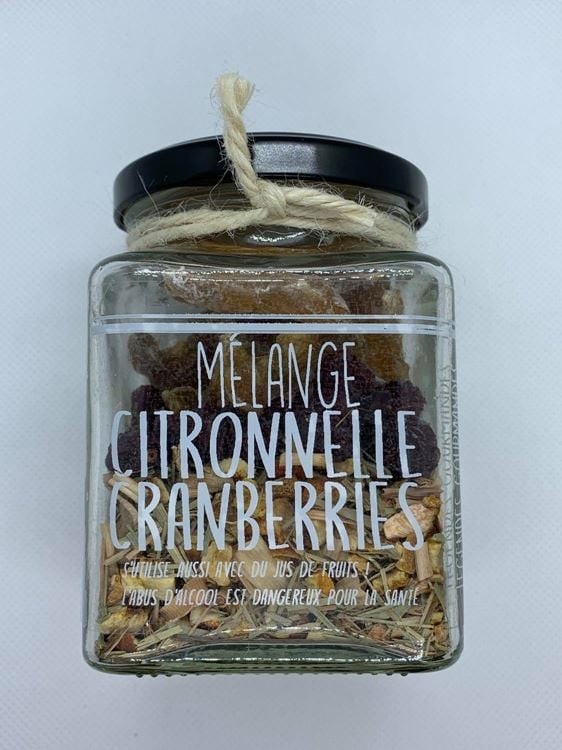 Ingrédients: Copeaux de citronnelle >20%, citronnelle odorante >15%, carambole déshydratée (carambole, sucre, acidifiant : E330, conservateur : E220 (anhydride sulfureux)). cranberries entières séchées >10% (cranberries, sucre, huile de tournesol), écorces d'orange, écorces de citron.