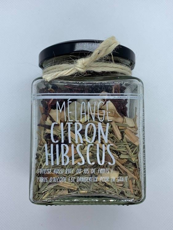 Ingrédients: Cubes d'écorces de citron (écorce de citron 49,18%, sirop de glucose-fructose, saccharose, dextrose, arôme naturel, conservateur : E220 (anhydride sulfureux)), copeaux de citronnelle >20%, citronnelle odorante >20%, fleur d'Hibiscus >15%.