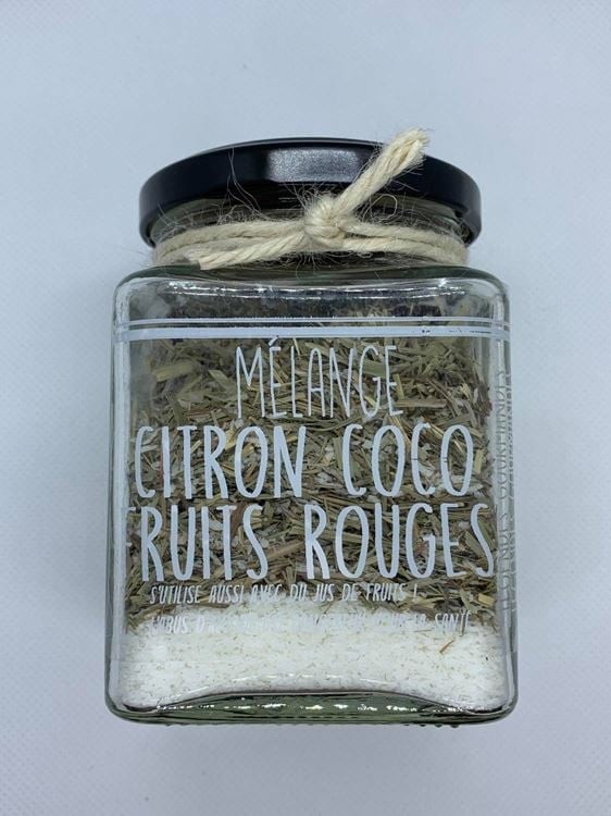 Ingrédients: Citronnelle odorante >40%, noix de coco râpée >25% (noix de coco, conservateur : E220 (anhydride sulfureux)), cranberries entières séchées >25% (cranberries, sucre, huile de tournesol).