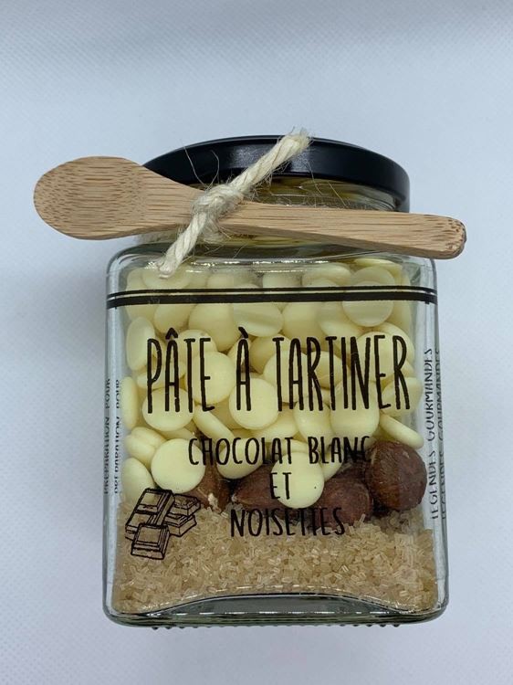 Ingrédients: Chocolat de couverture blanc >70% (sucre, beurre de cacao 31,5%, poudre de lait écrémé 20%, matière grasse laitière anhydre 8,0%, émulsifiant : lécithine de soja, arôme naturel de vanille, arôme), noisettes entières >10%, sucre roux.