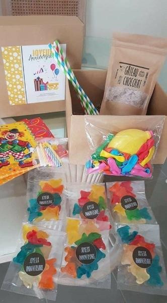 Coffret contenant une préparation pour gâteau au chocolat, des confiseries gélifiées, des bougies, des serviettes en papier, un kit ballon + gonfleur et des pailles