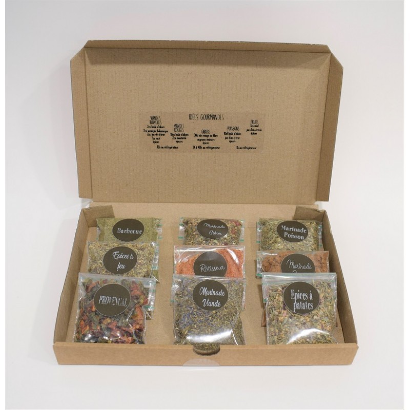 Ingrédients:Mélange d'épices (Epices à feu). coriandre, genièvre, thym, romarin, fenouil, laurier, marjolaine, basilic, sauge . Poids net : 15g