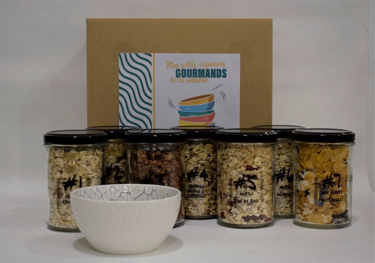 Flocon d'avoine, baie de goji 20%, cranberries entières séchées (cranberries, sucre, huile de tournesol), grains de riz soufflé nature 50% (riz, sucre, sel, arôme de malt d'orge).
