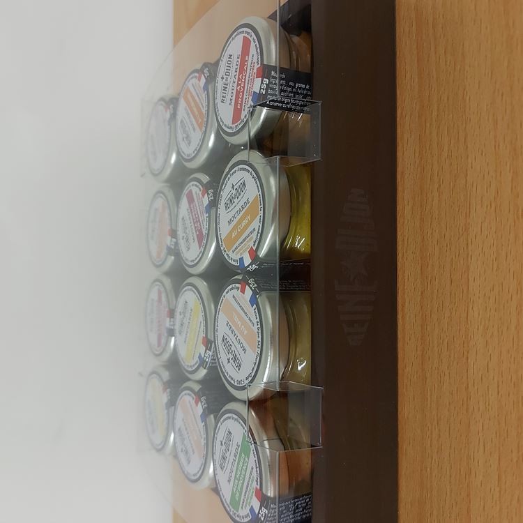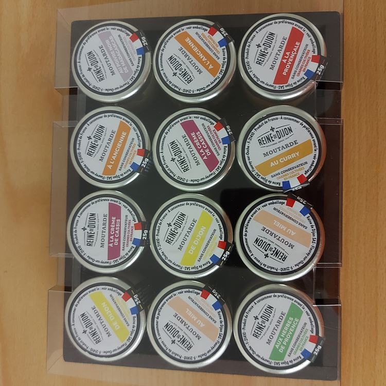 - Moutarde aux herbes de Provence (poids net 25g) : Eau, graines de moutarde, vinaigre d'alcool, sel, herbes de Provence (0,8%), arôme naturel, acidifiant (acide citrique), conservateur (disulfite de potassium).